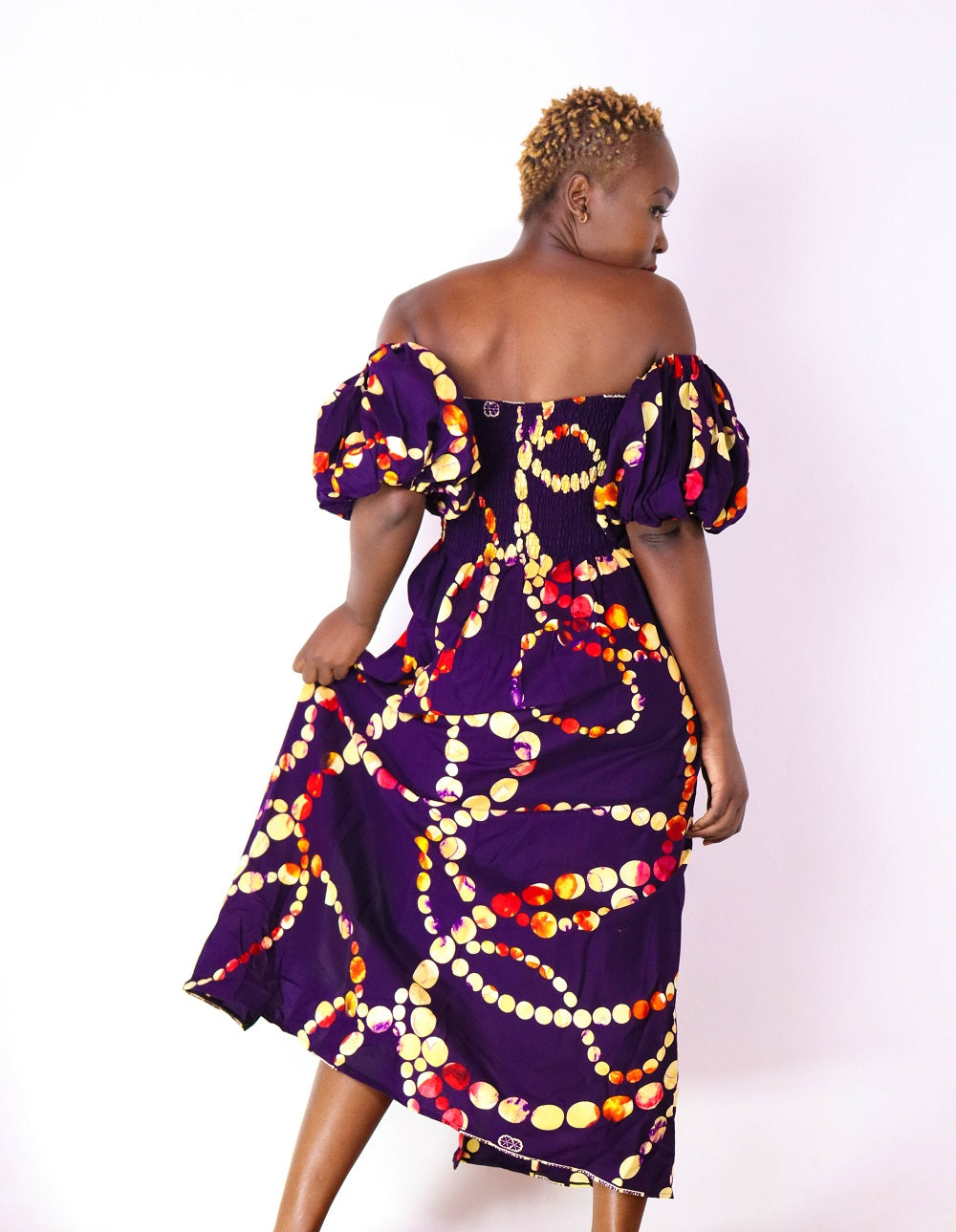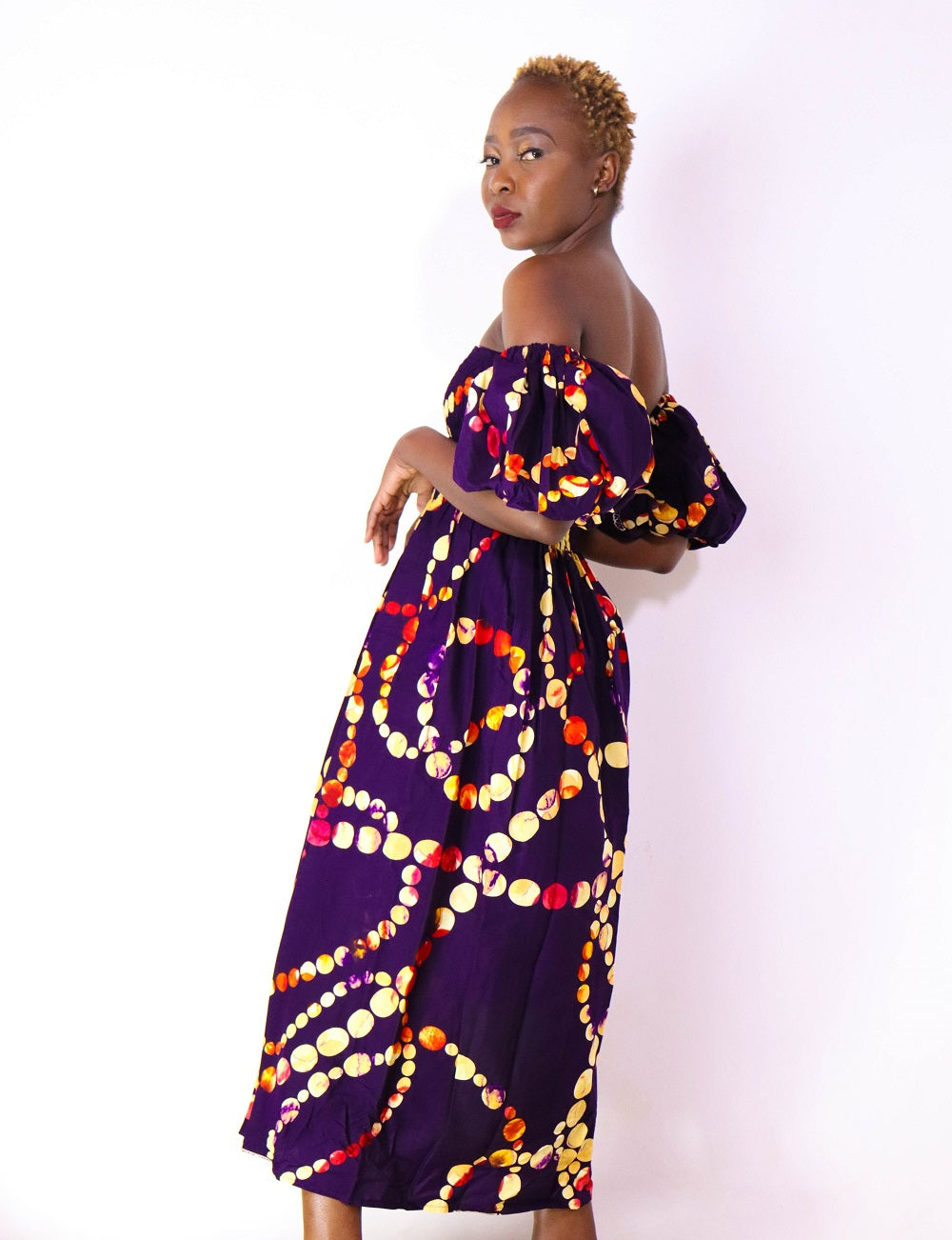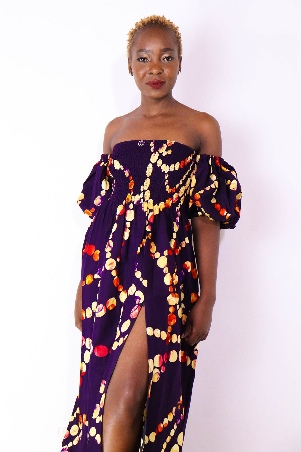Jaali Women's African Print Off-Shoulder Maxi Dress (Purple)