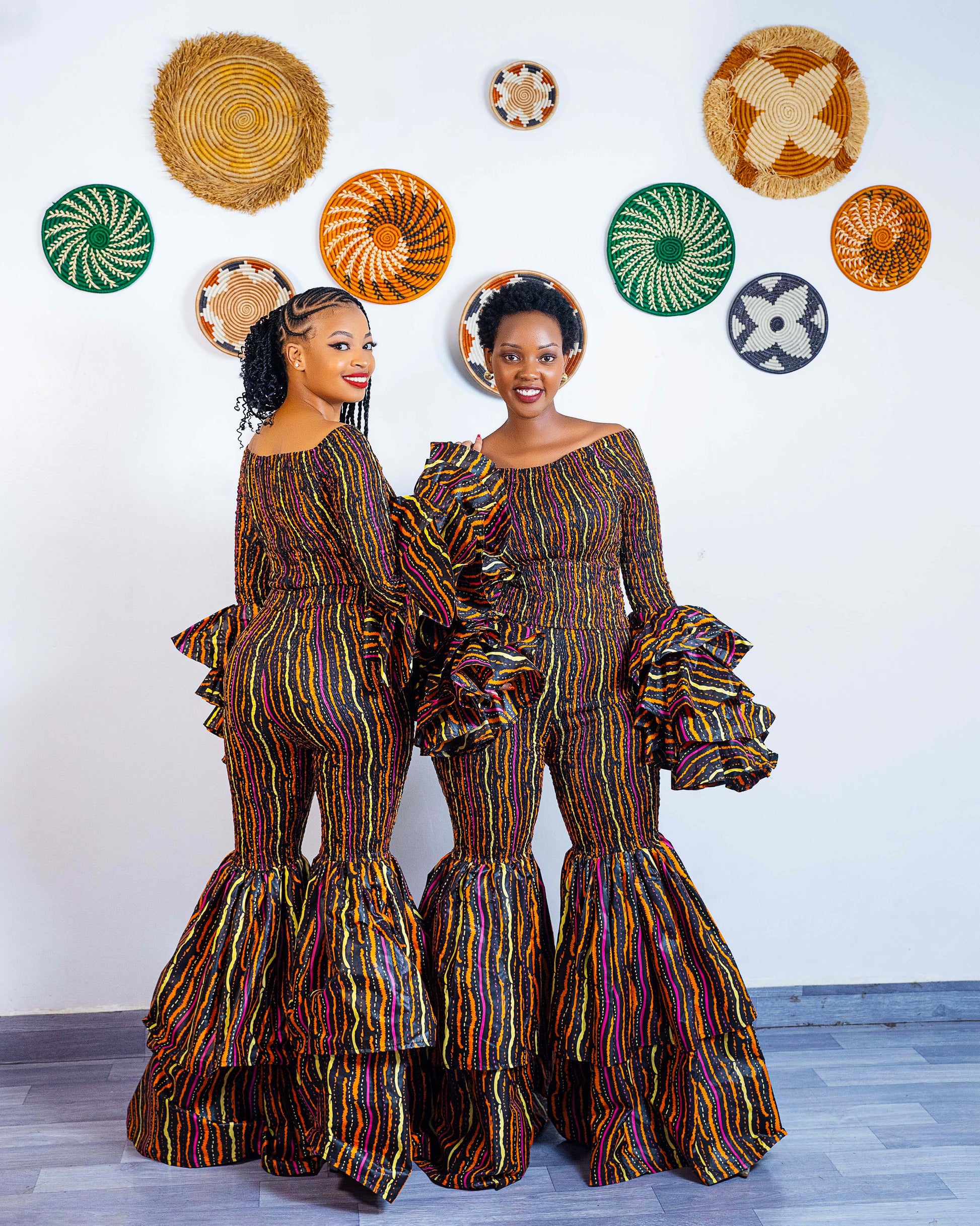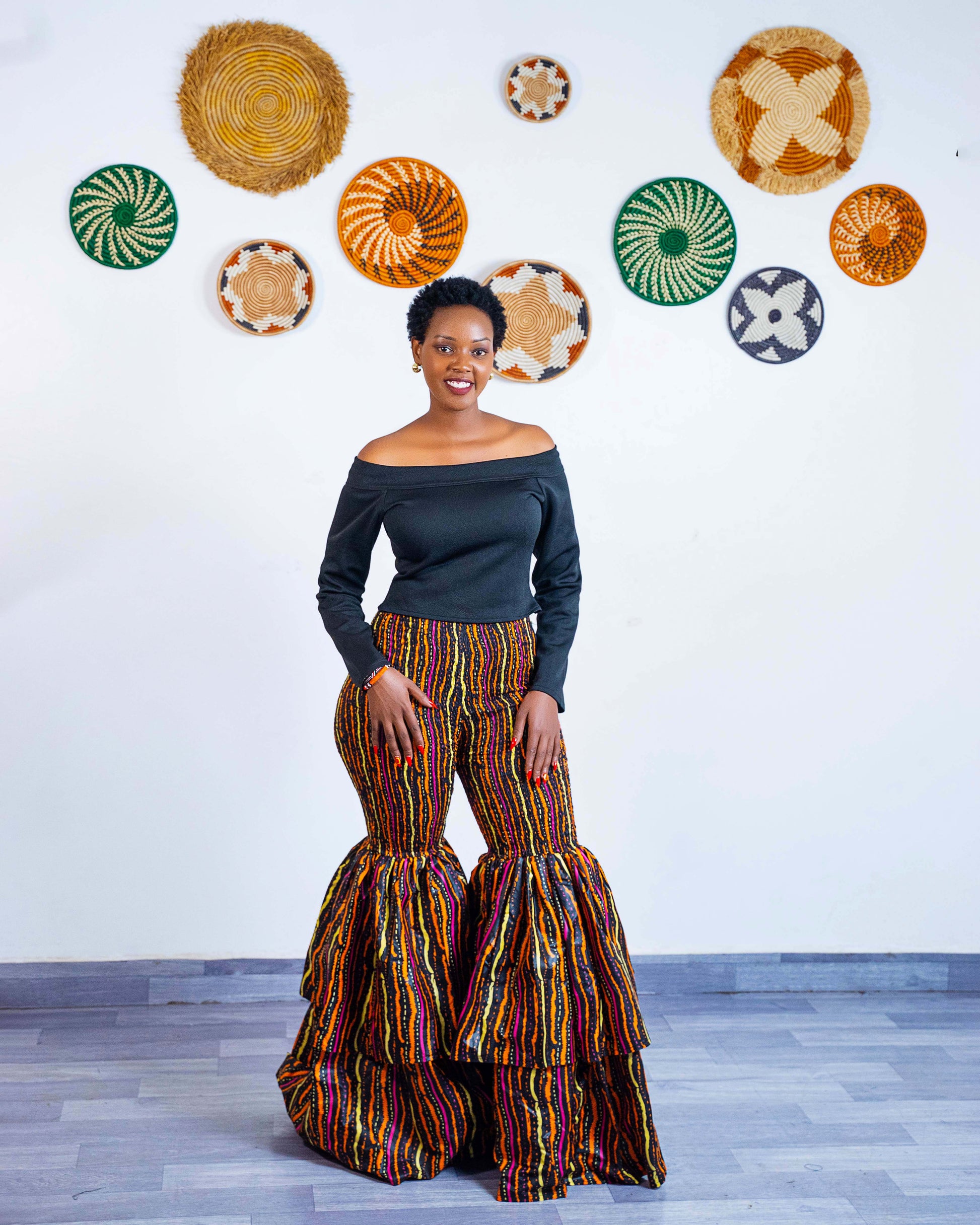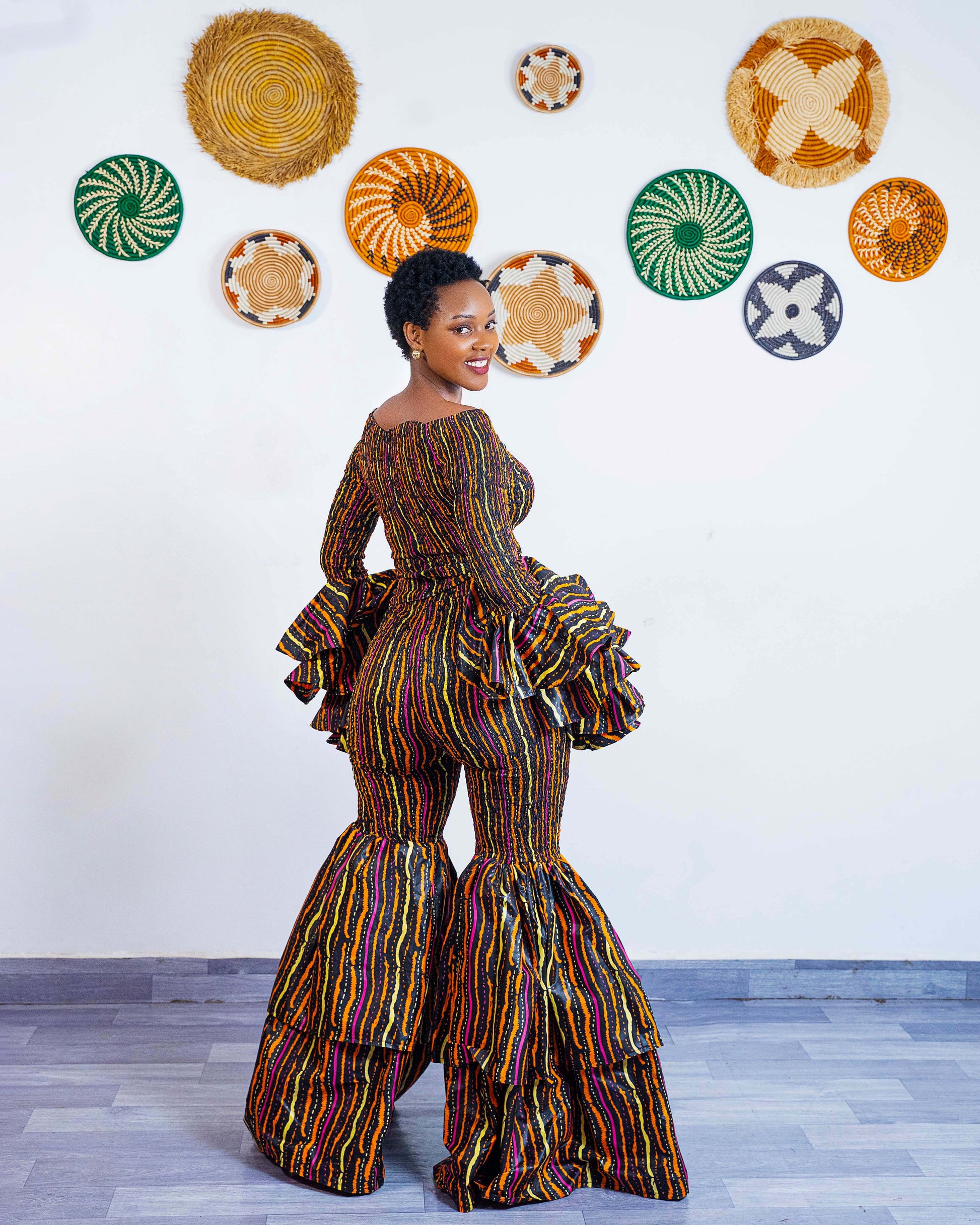 These bell bottom Ankara pants are designed to flatter your body as they are high-waisted for that snatched silhouette and crafted from soft, quality African fabric to ensure they hug you in all the right places. The unique smocked upper and dramatic tiered flare from the knee down provide an eye-catching volume that ensures you stand out in any crowd.