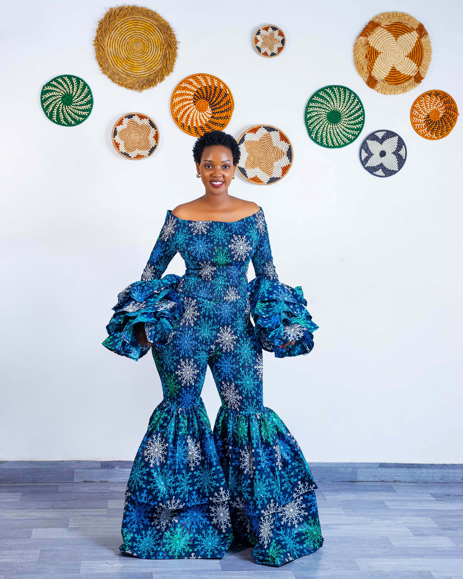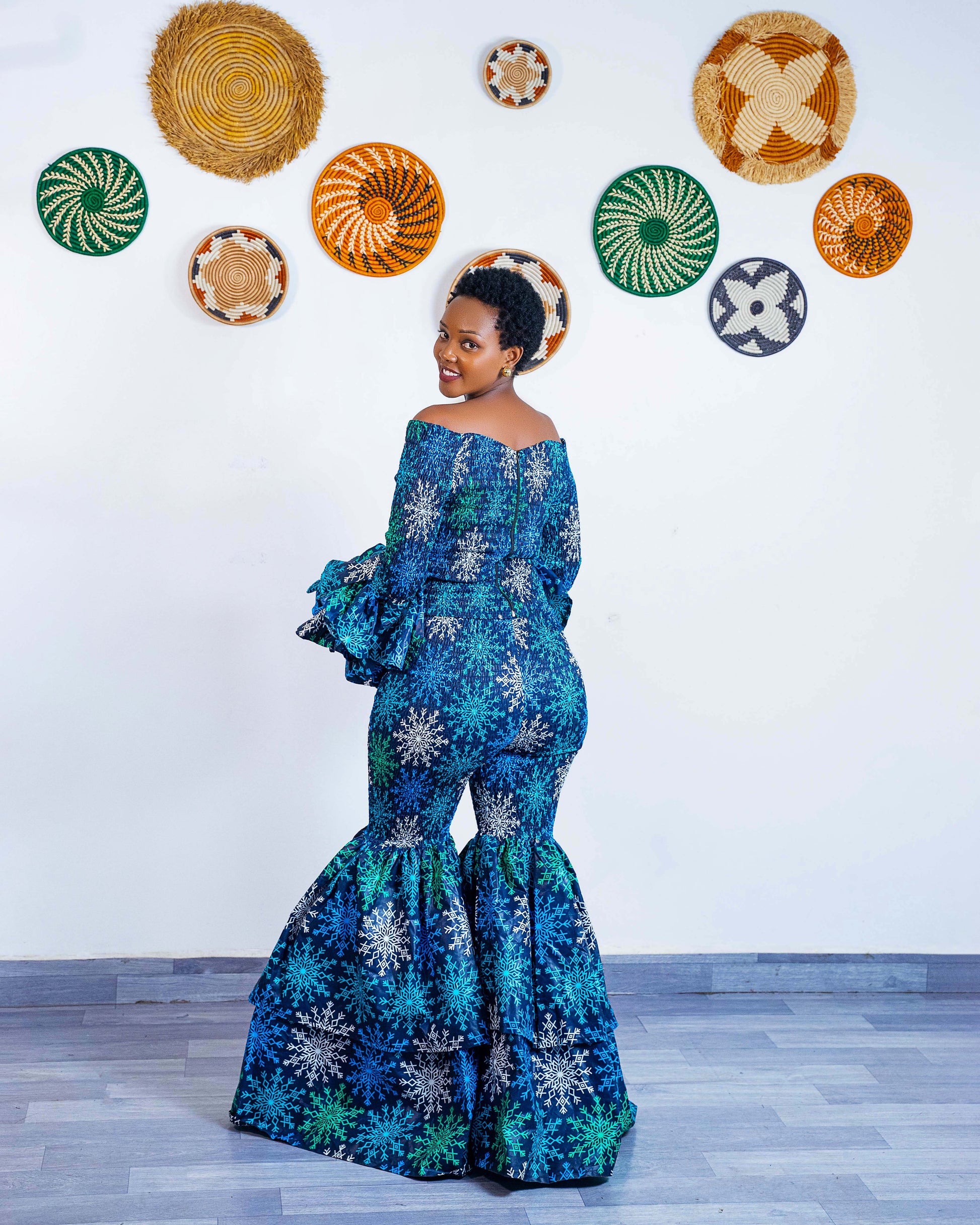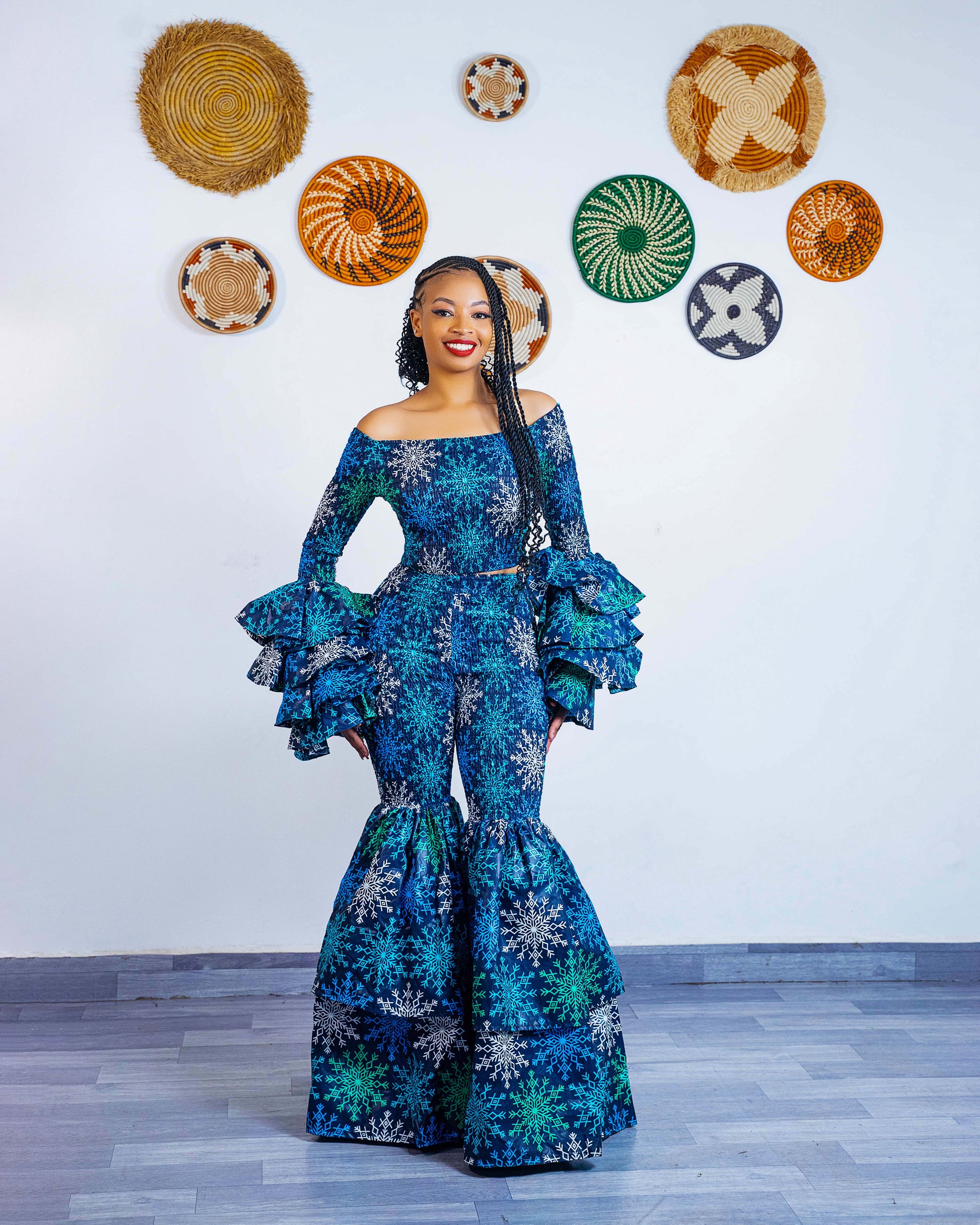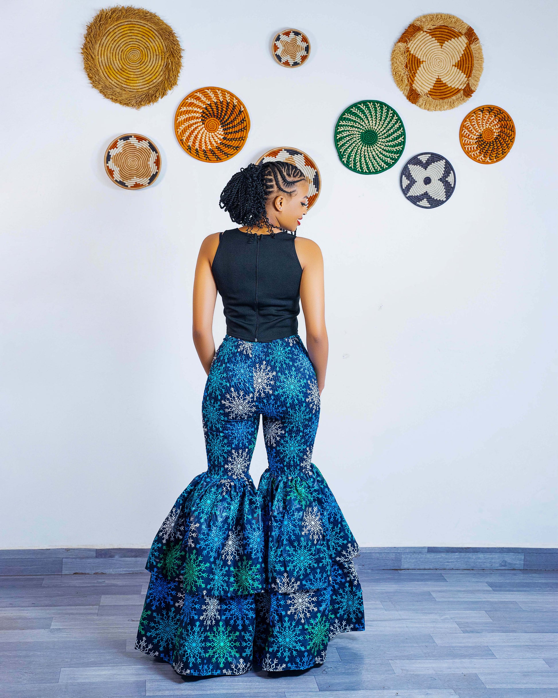 These bell bottom Ankara pants are designed to flatter your body as they are high-waisted for that snatched silhouette and crafted from soft, quality African fabric to ensure they hug you in all the right places. The unique smocked upper and dramatic tiered flare from the knee down provide an eye-catching volume that ensures you stand out in any crowd.
