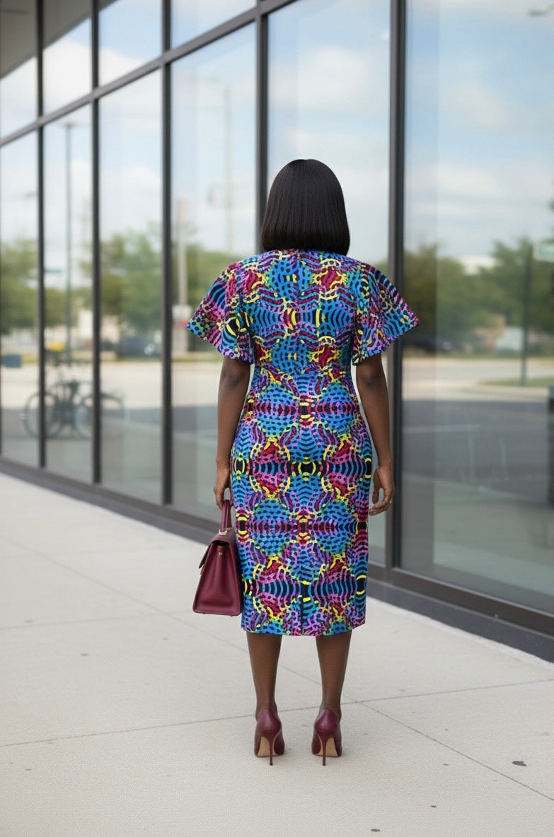 Brighten up your day with the Nala Ankara Midi Dress. This colorful dress features a beautiful mix of patterns and a comfortable fit that moves with you. It is the perfect choice for a sunny brunch, a wedding guest outfit, or a stylish day at the office.