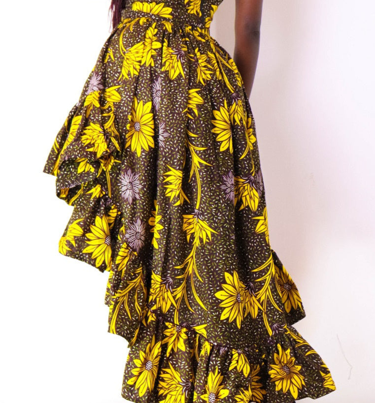 The high-low hem swishes and sways with a drama usually reserved for soap opera exits, making every entrance (and exit) memorably fabulous. Adorned with vibrant African prints, it's like wearing a piece of art – only more twirlable.