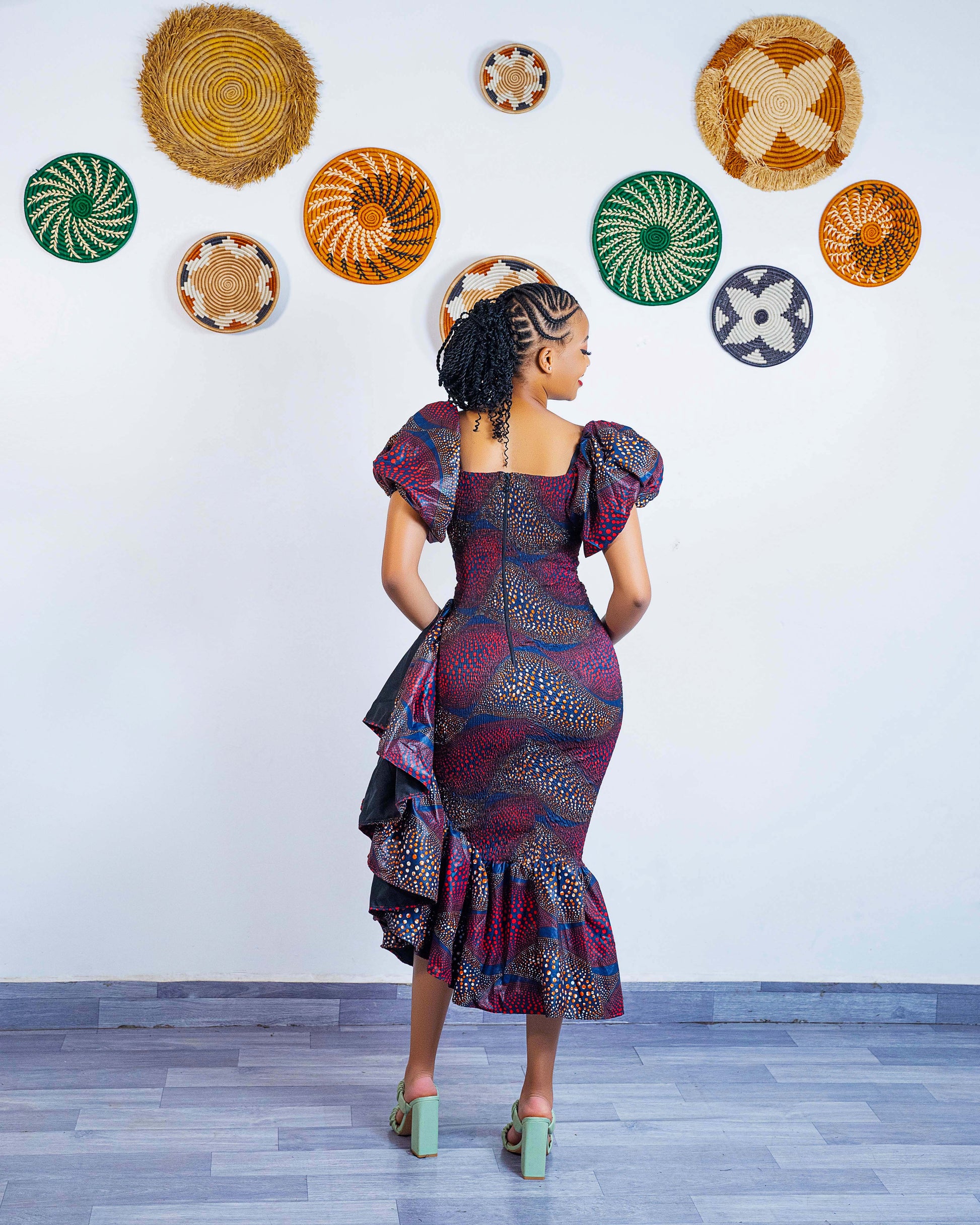 This maroon and gold Ankara dress is designed to flatter your body with an all-over smocked bodice that creates a snatched silhouette. Crafted from soft, quality African fabric, it ensures a perfect hug for your curves while the off-shoulder puff sleeves and ruffled hem provide a romantic, elevated look.